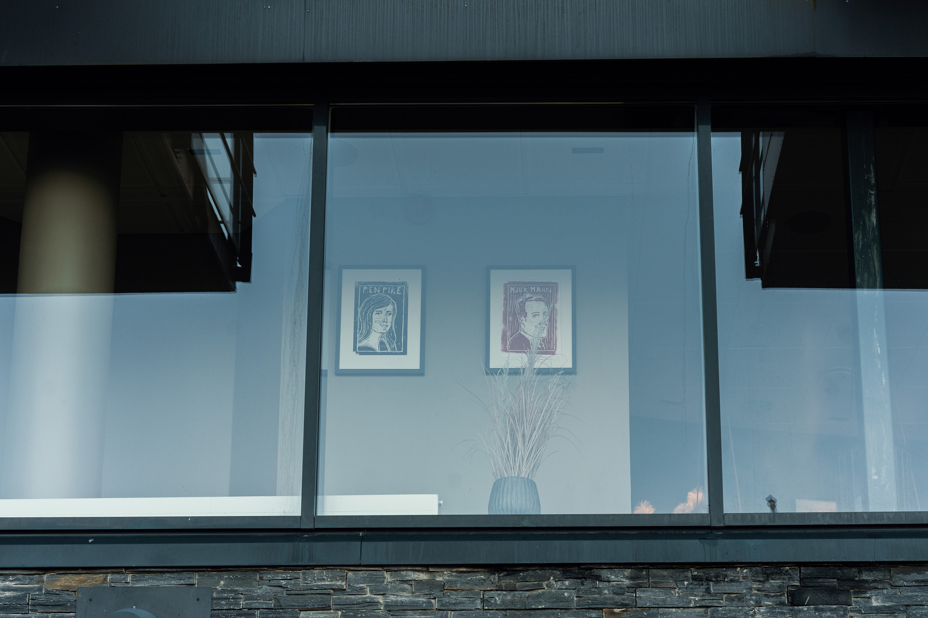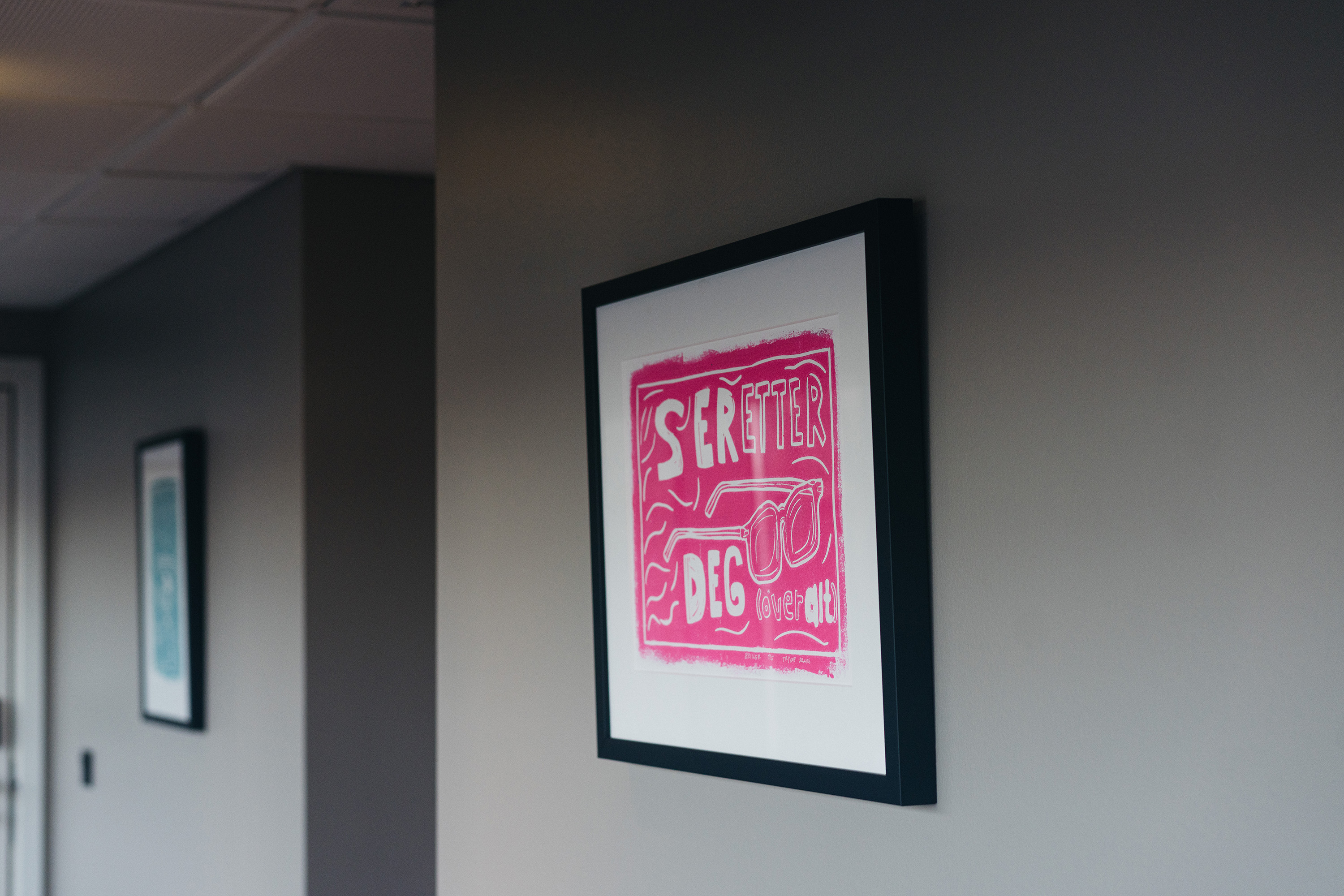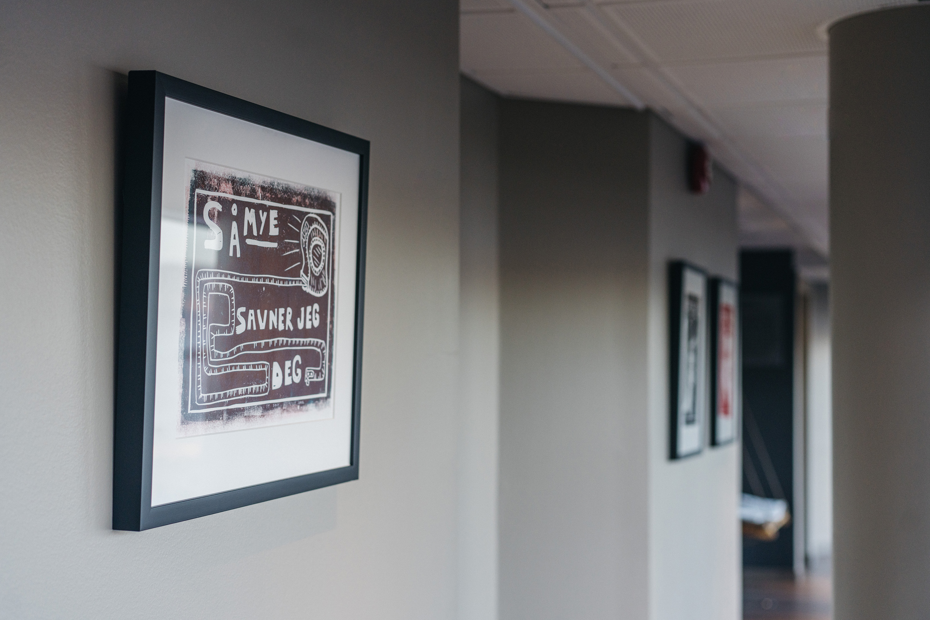The glass sculpture named "Beskytte" is from 2024 and is made of clear glass mounted on a diabase base. The sculpture is modeled by Nico in clay, then a reinforced refractory mold is made of plaster and chamotte. The molds are filled with molten glass at Hadeland Glassverk, where they remain in cooling ovens for a couple of months before they are completed. You can find this in the bar area.